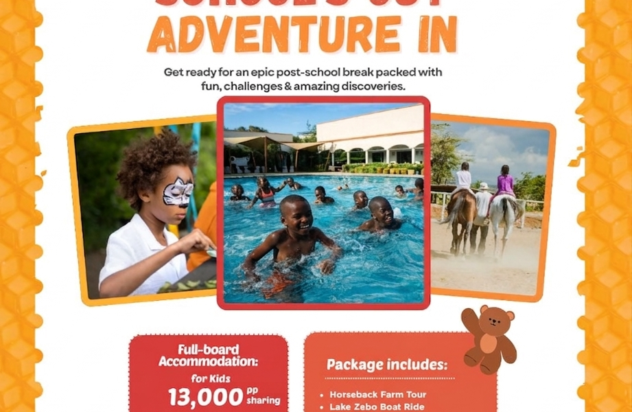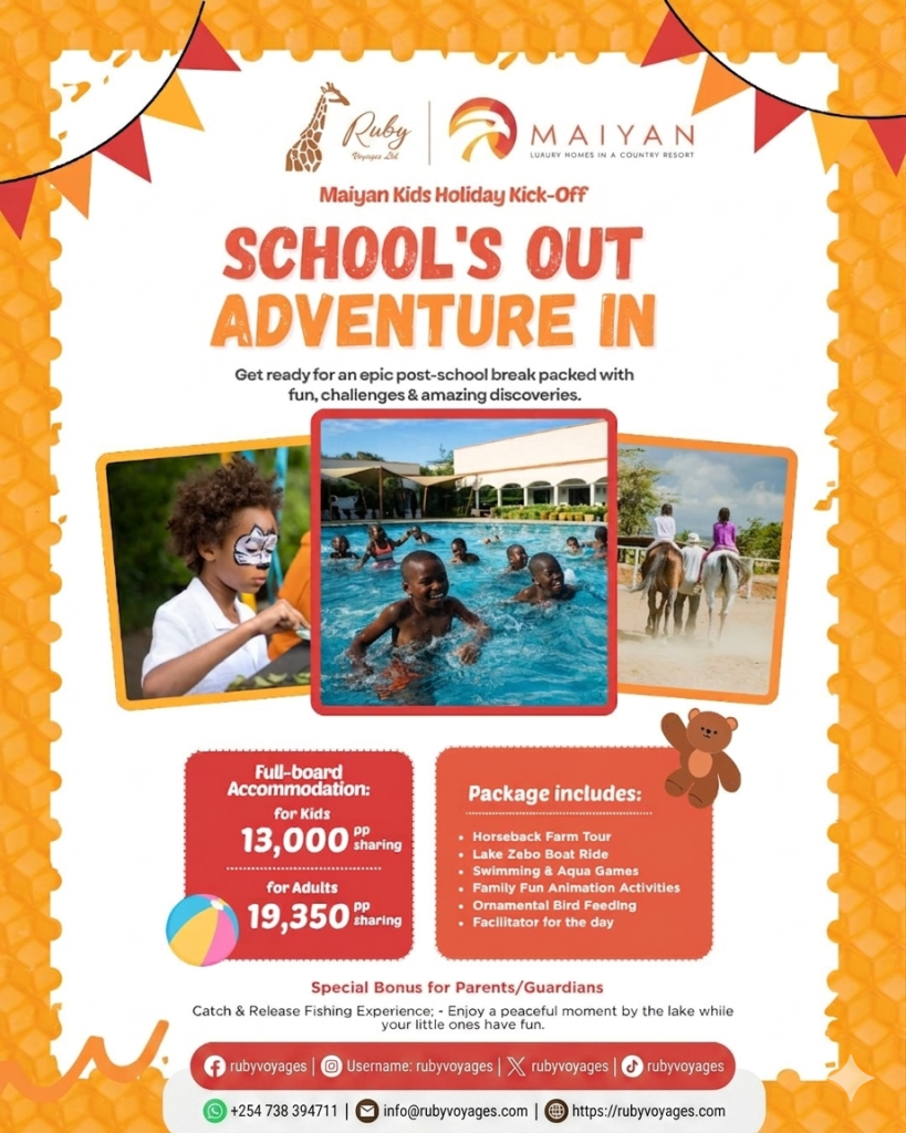 Maiyan Kids Holiday Kick-Off — Full-board accommodation included. Kids: KES 13,000 per person sharing. Adults: KES 19,350 per person sharing. Activities included: Horseback Farm Tour, Lake Zebo Boat Ride, Swimming and Aqua Games, Family Fun Animation Activities, Ornamental Bird Feeding, Facilitator for the day. Special bonus for parents: Catch and Release Fishing Experience. Terms and conditions apply. Contact Ruby Voyages to confirm availability.
